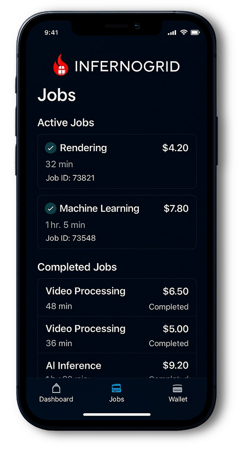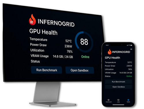 Zero-friction setup – Install once, InfernoGrid handles job routing, monitoring, and payouts.